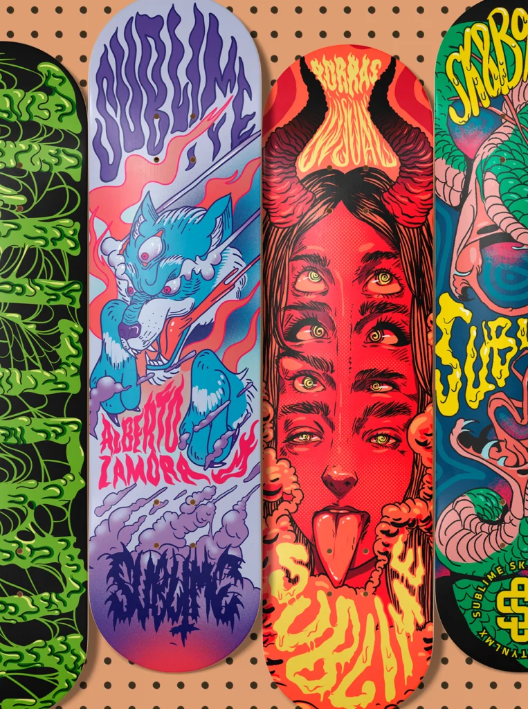 Gráficos e ilustraciones para playeras, jerseys, cascos, stickers, skateboards y productos de marca.